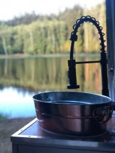 Kuchnia bez zlewu to duże ograniczenie. Większość kamperów ma kompaktowy zlew stalowy lub z tworzywa zintegrowany z kuchenką.